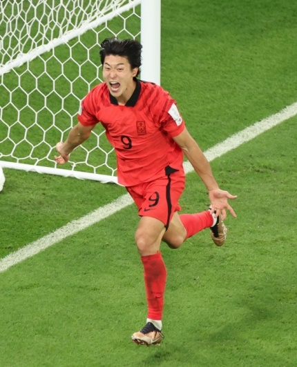28일 오후10시(한국시간) 카타르 알라이얀의 에듀케이션 시티 스타디움에서 열린 2022 카타르 월드컵 조별리그 H조 2차전 대한민국과 가나의 경기. 조규성이 동점골을 넣고 환호하고 있다. 연합뉴스