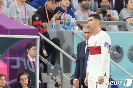 (알라이얀(카타르)=뉴스1) 이동해 기자 = 2일 오후(현지시간) 카타르 알라이얀 에듀케이션 시티 스타디움에서 열린 2022 카타르 월드컵 조별리그 H조 3차전 대한민국과 포르투갈의 경기에서 포르투갈 크리스티아누 호날두가 후반 교체되고 있다. 2022.12.3/뉴스1 Copyright (C) 뉴스1. All rights reserved. 무단 전재 및 재배포 금지.