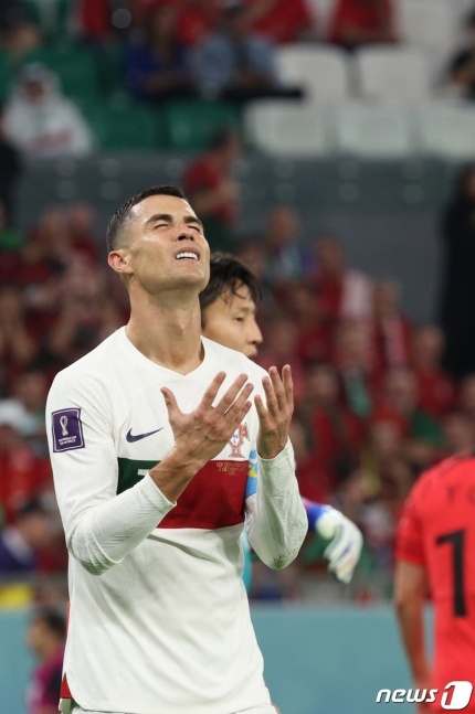 (알라이얀(카타르)=뉴스1) 이동해 기자 = 2일 오후(현지시간) 카타르 알라이얀 에듀케이션 시티 스타디움에서 열린 2022 카타르 월드컵 조별리그 H조 3차전 대한민국과 포르투갈의 경기에서 포르투갈 크리스티아누 호날두가 공격 실패 후 아쉬워 하고 있다. 2022.12.3/뉴스1 Copyright (C) 뉴스1. All rights reserved. 무단 전재 및 재배포 금지.
