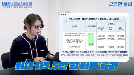 마지막으로 연말정산 환금액을 높이기 위한 마지막 팁 나갑니다. 바로 연금저축계좌, IRP 등 퇴직연금계좌에 연간 700만원까지 납입하는 것입니다. 이전 영상에서 퇴직연금계좌 가입법을 다루기도 했는데요. 총급여에 따라 공제율 차이는 있지만 납입액의 15%의 세액공제를 적용하면 지방소득세를 포함해 최대 115만5000원의 세액환급 효과를 볼 수 있습니다.