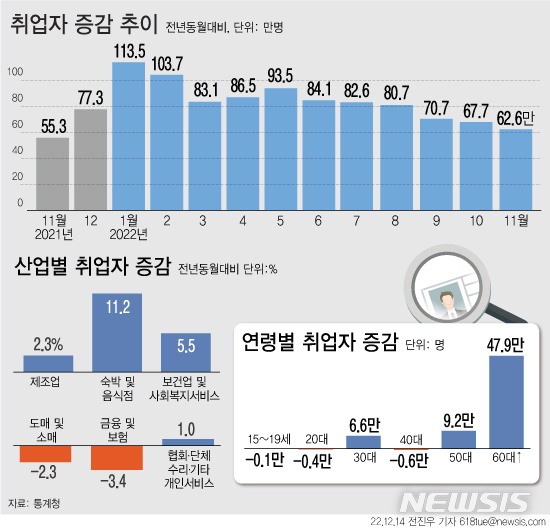통계청이 12일 발표한 '2022년 11월 고용동향'에 따르면 지난달 취업자 수는 2842만1000명으로 1년 전보다 62만6000명(2.3%) 늘었다. 같은 달 기준으로는 1999년 11월(121만7000명) 이후 23년 만에 최대 증가 폭이다.