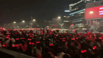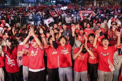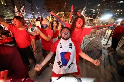[헤럴드경제=김희량·배두헌 기자] 24일 오후 10시 한국과 우루과이의 2022 카타르월드컵 조별리그 H조 1차전을 앞두고 서울 종로구 광화문 광장에는 거리응원을 나온 한국 축구팬들의 "대~한민국" 함성이 울려퍼졌다.