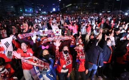 2022 카타르 월드컵 조별리그 H조 1차전 대한민국과 우루과이의 경기가 열리는 24일 오후 서울 종로구 광화문광장 육조마당에서 붉은악마와 시민들이 거리응원을 하고 있다. [연합]