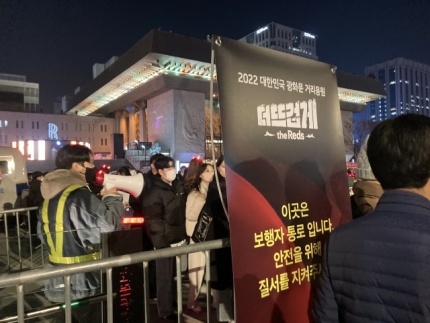 2022 카타르 월드컵 조별리그 H조 1차전 대한민국과 우루과이의 경기가 열린 24일 오후 서울 종로구 광화문광장 육조마당에서 경찰이 배치돼 있다. 펜스 앞으로 보행자 통로를 알리는 팻말이 설치돼 있다. [김희량 기자]