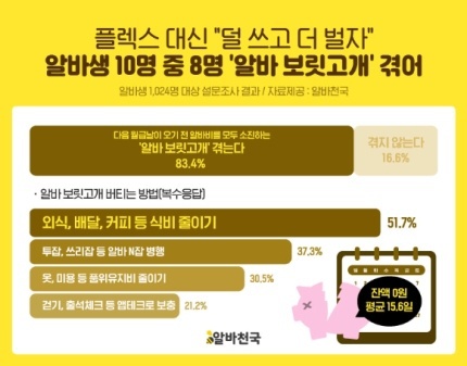 보릿고개 기간은 덜 쓰고 더 벌어서 해결하는 것으로 나타났다. 부족한 알바비를 보충하기 위해 '외식, 배달, 커피 등 식비를 최소화(51.7%)'하고 '투잡, 쓰리잡 등 아르바이트 N잡(37.3%)'을 병행한다는 답변이 1,2위를 차지했다.