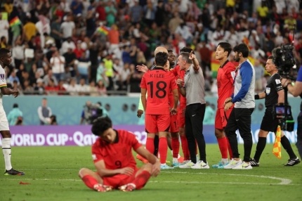(알라이얀(카타르)=뉴스1) 이동해 기자 = 28일 오후(현지시간) 카타르 알라이얀 에듀케이션 시티 스타디움에서 열린 2022 카타르 월드컵 조별리그 H조 2차전 대한민국과 가나의 경기에서 벤투 감독과 손흥민, 이강인 등이 마지막 코너킥 상황에 종료 휘슬을 분 앤서니 테일러 주심에게 항의하고 있다. 2022.11.28/뉴스1 /사진=뉴스1화상