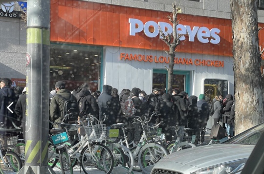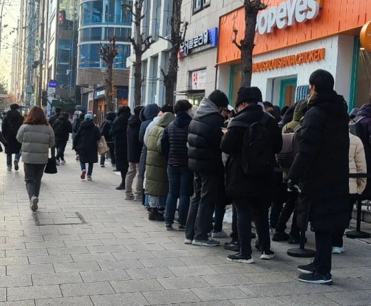 16일 오전 서울 서초동 강남역 인근에 재개장 1호점이 열린 패스트푸드 ‘파파이스’ 매장 앞에 입장을 기다리는 사람들이 줄을 서 있다. SNS 캡처